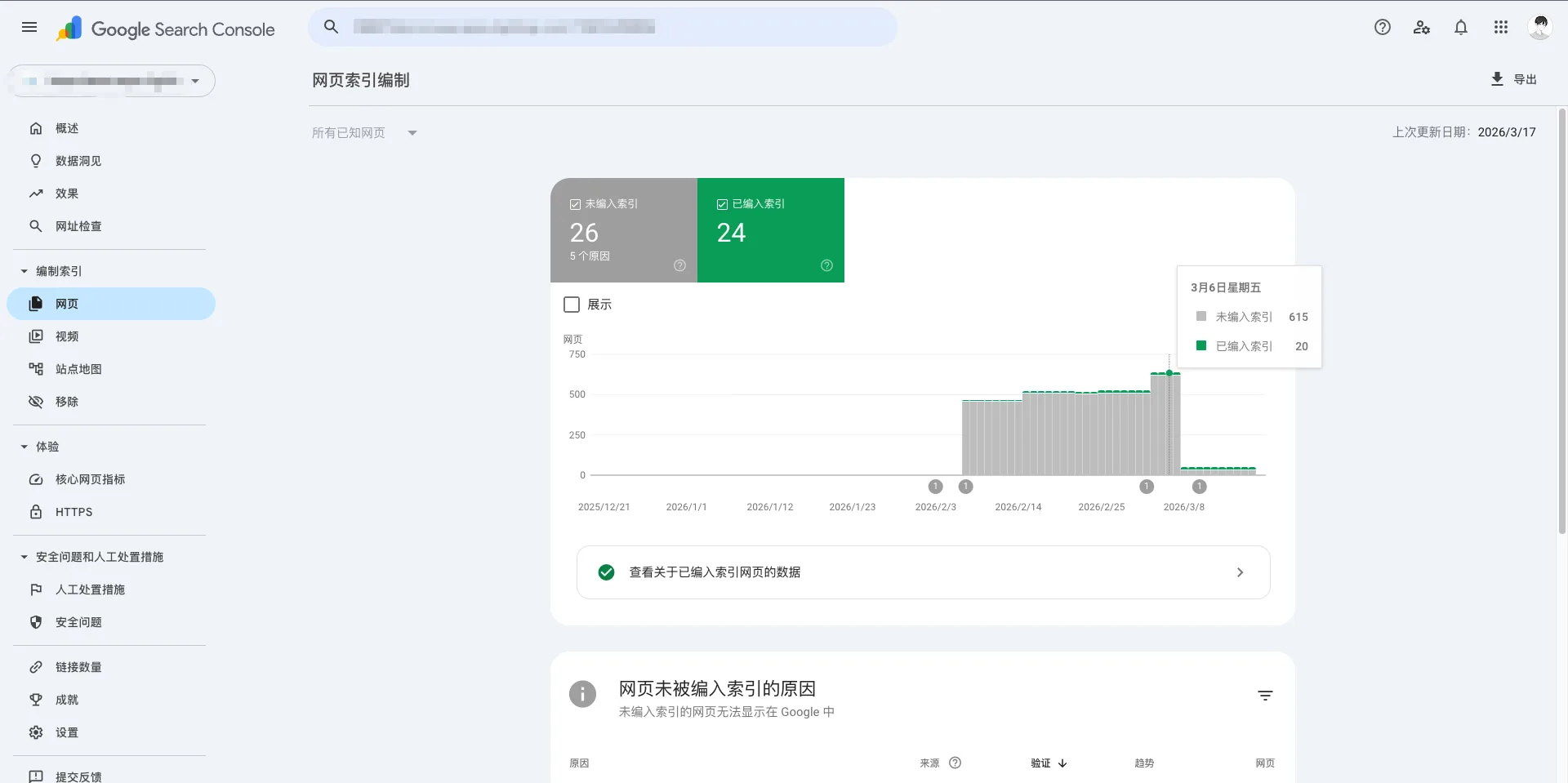 后续更新后,页面状态改善为:未编入索引 26,已编入索引 24