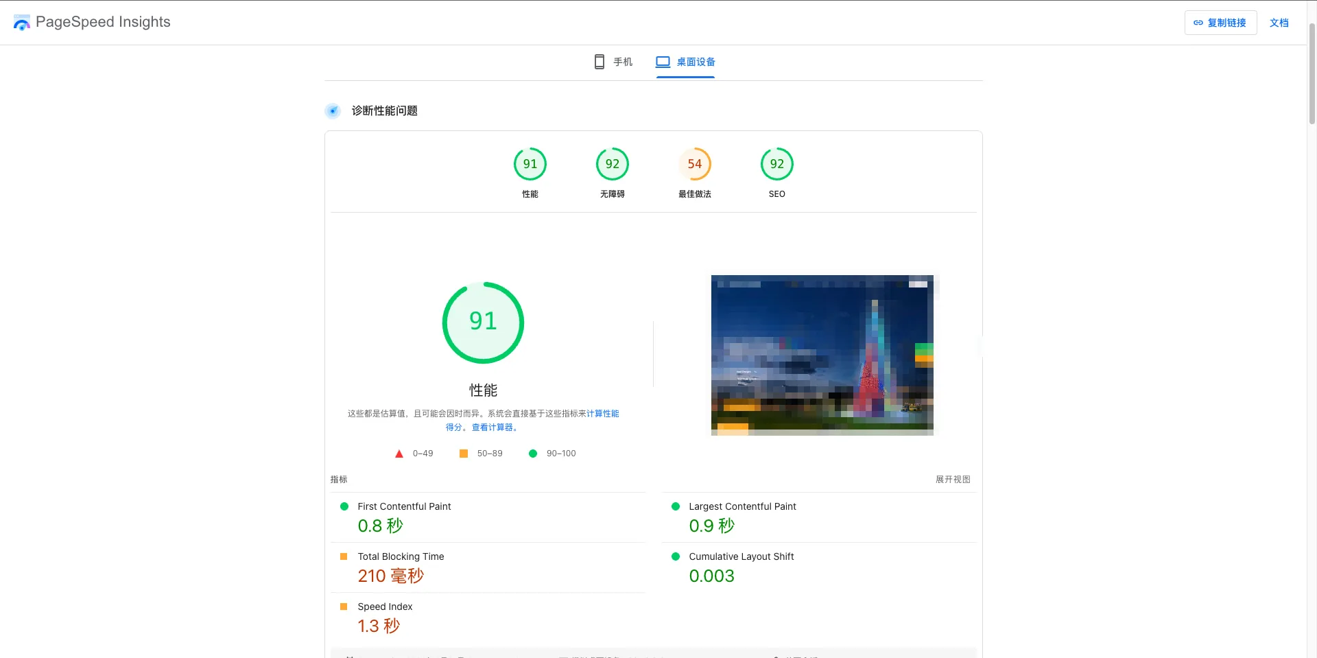 同时,从 PageSpeed Insights 数据来看,网站桌面端基础表现也较好: